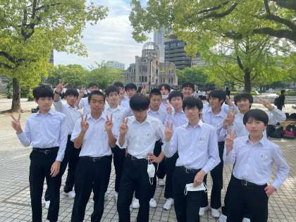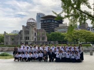 平和公園に移動し、原爆ドームをバックに記念撮影です。