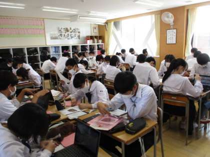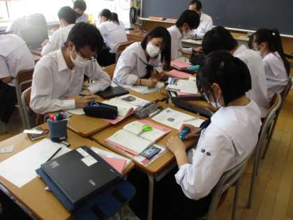 1、2限、3年生は修学旅行の事後学習として、レポートの作成を行いました。見学先のパンフレット等を活用して3日間で学んだことをまとめました。写真は31Hの様子です。