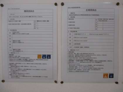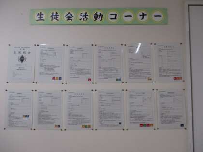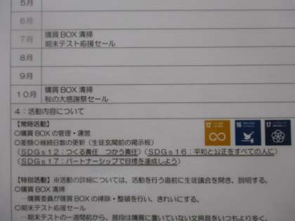 玄関から入ってB棟に向かう廊下の壁に生徒会活動コーナーがあります。先日の生徒総会で決定した各委員会の活動計画が掲示してあります。右下の色の付いたマークはどのSDG'sの項目に関連があるかを示しています。
