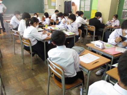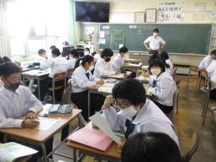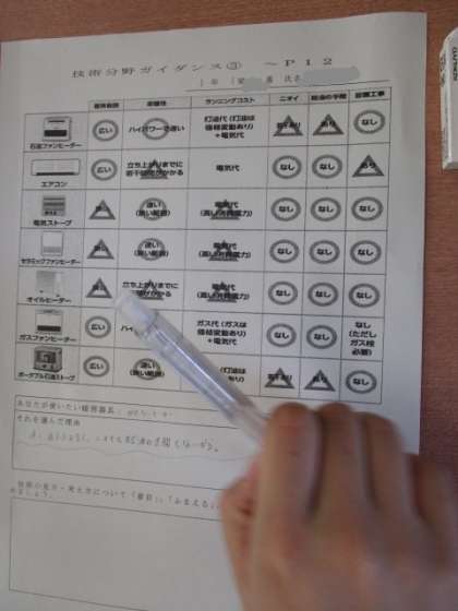 学習課題は「技術の見方・考え方とは?」です。電気、ガス、エアコン、ファンヒーター等、様々な暖房器具のメリット、デメリットを比較したうえで、どれが一番よいか、自分の考えを班員に論じています。