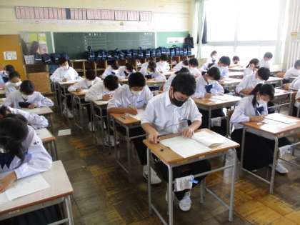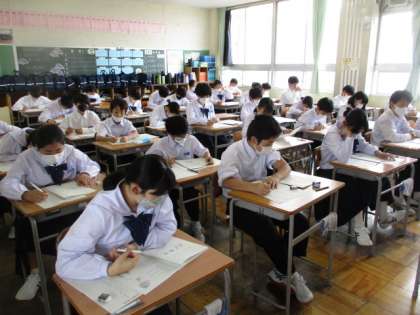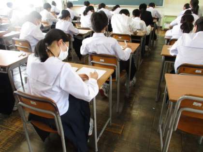 今日は、1学期中間考査2日目です。今回が1年生にとって初めての定期考査になりました。写真は1年生2限の数学の時間で、上段から17H、18H、19Hの様子です。無監督テストで行っています。