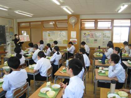 今日は、21Hで栄養と体の関係について、パネルを使って分かりやすく話をされました。生徒たちは、興味深そうに聞いていました。給食を残さず食べて、元気に学校生活を送りましょう。