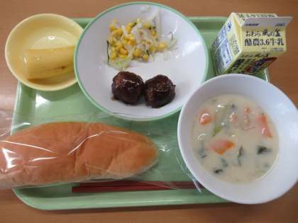 コッペパン 牛乳 ミートボール 水菜のサラダ ほたてのクリーム煮