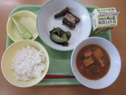ごはん 牛乳 いわしの土佐煮 酢の物 厚揚げのみそ煮込み メロン