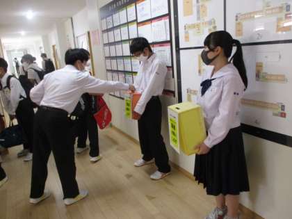 今朝は曇りでしたが、さわやかな朝になりました。玄関ではボランティア委員会の生徒がコロナ対策への募金を行っています。今日の下校完了時間は、18:00です。