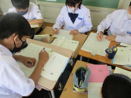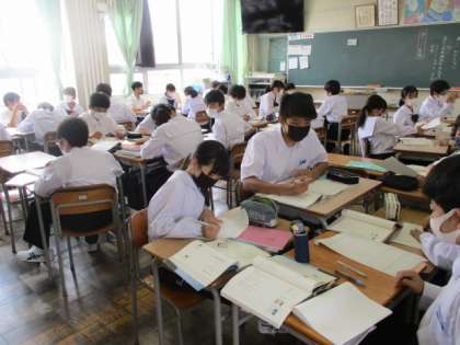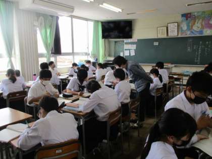 3限16Hの様子です。谷川俊太郎の詩を題材に「詩のリレー感想」をしています。、自分の感想をワークシートに記入し、それをグループ内で回して友達の感想を読みます。人によって様々な感じ方があることを知りました。