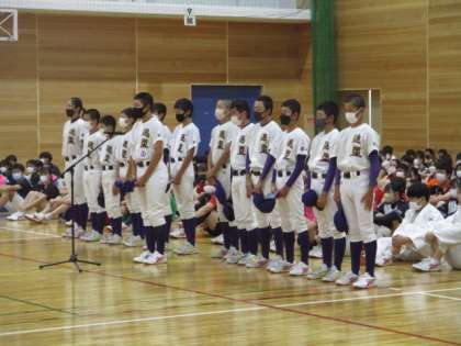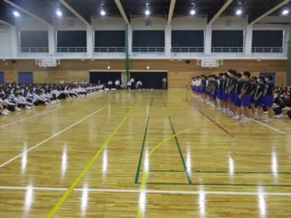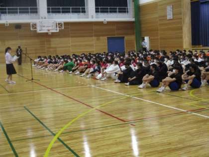 6限、17日(金)から開催される富山市中学校総合選手権大会に向けた壮行会を行いました。生徒会執行部代表からの激励の言葉があった後、各部の部長から大会に向けた抱負が述べられました。