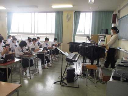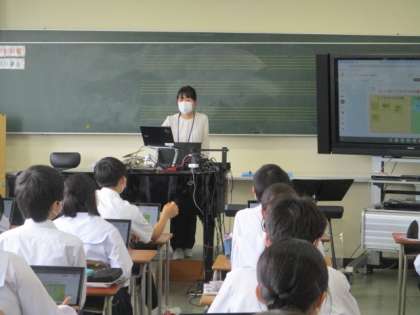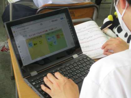 スメタナ作曲の「ブルタバ」(モルダウ)を聴いて、作曲者の思いを感じ取り、「ブルタバ」の紹介文を書きます。生徒はタブレットパソコンを使ってグループの意見を共有していました。