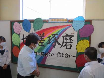 1学年生徒会が、校長先生に学年目標に込められた思いを伝えています。
