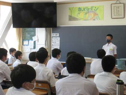 2学年では、2限に体育大会の団リーダーに立候補した生徒による演説と投票を行いました。体育大会の成功のため、真剣に話をし、真剣に聴いています。