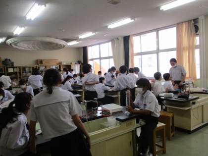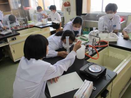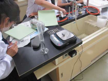 5限14Hの様子です。電子てんびんとメスシリンダーを使って、物質の質量と体積を計り、密度を計測しています。