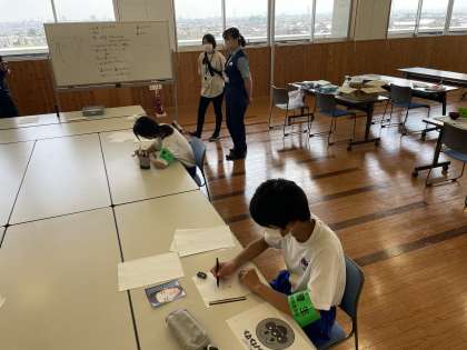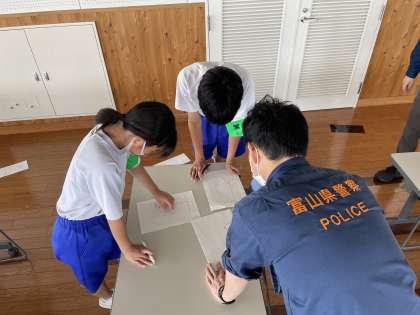 富山西警察署の活動の様子です。今日は、さまざまな特徴をもとにした似顔絵の作成や足跡を捜査する活動をしました。