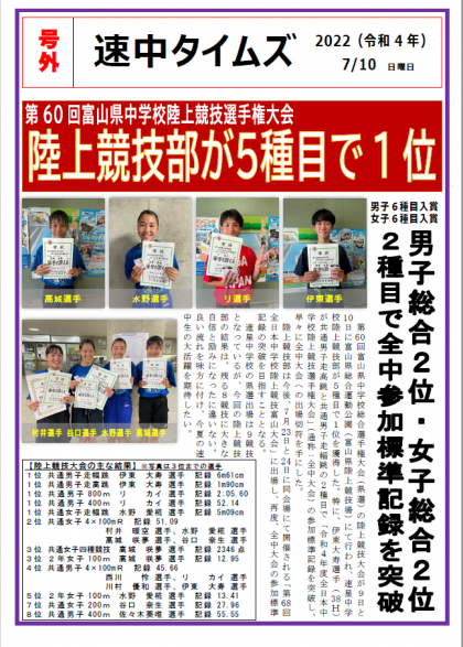 昨日から開催されている富山県中学校総合選手権大会の陸上競技大会での、本校陸上競技部の活躍を「速中タイムズ『号外版』」として発行しました。
