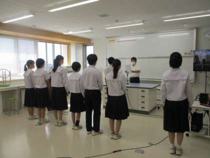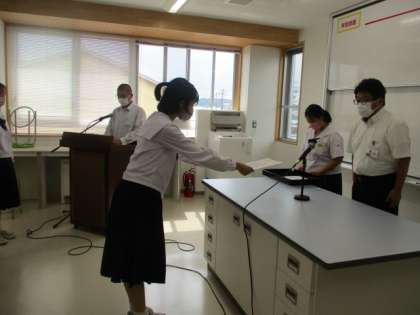 終学活後、体育大会実行委員任命式・団旗授与式を被服室で行いました。教室の生徒はモニターのライブ配信を通して参加します。校長先生から実行委員に任命状が授与されました。