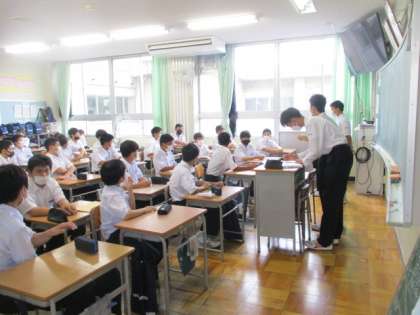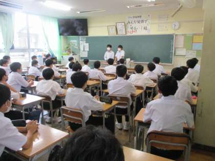 3限、各学年で体育大会の100m走の走順や係を決めるための団別集会を開きました。1年生の集会には3年生のリーダーが補佐してくれます。写真は白龍団・青雲団1年生男子です。