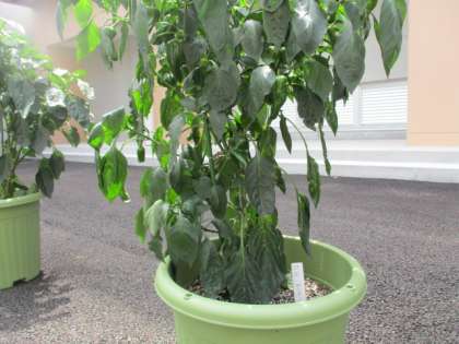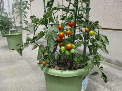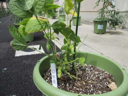 2年生技術・家庭科で栽培している夏野菜が実を付けています。上から枝豆、ミニトマト、ピーマンです。