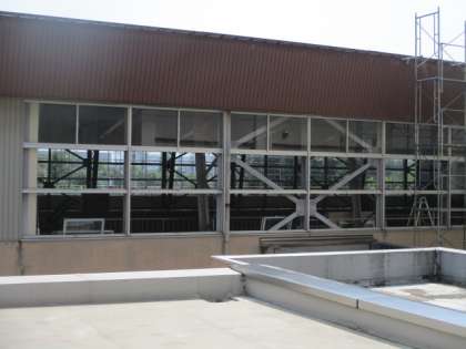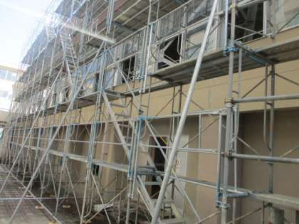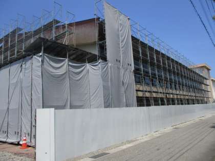 旧体育館の解体作業が始まっています。体育館の周りは足場に囲まれています。
