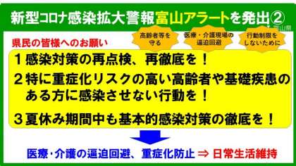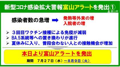 県内の新型コロナ感染状況について、これまでにない速さで急拡大しております。この状況を踏まえ、令和4年7月27日から8月9日までを期限として、富山アラートを発出します。