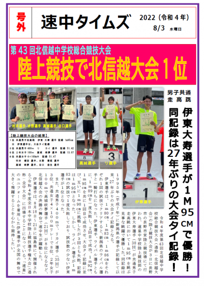 8/1から開催されている北信越中学校総合競技大会の速星中学校の活躍を「速中タイムズ『号外版』」として発行しました。