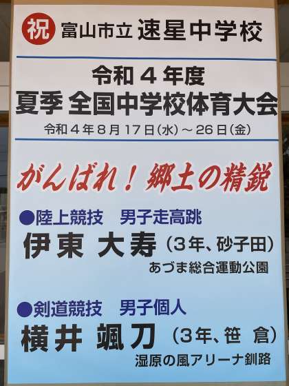 令和4年度全国中学校体育大会に出場する本校選手への激励ポスターを速星公民館に作成いただきました。1枚は公民館に掲示いただきます。そして、もう1枚は速星中学校の正面玄関に掲示させていただきました。速星公民館には、本当にありがとうございます。