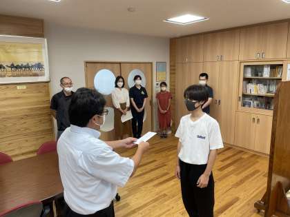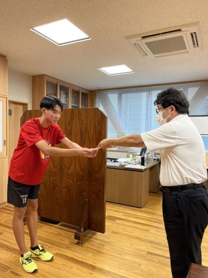 令和4年度全国中学校体育大会に出場する伊東選手(陸上競技)と横井選手(剣道)を林校長先生が激励しました。