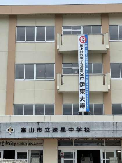 陸上競技部の伊東選手の全中大会での活躍については、本HPでもお伝えしたところですが、このたび、本校教育振興会のご協力をいただき『懸垂幕』を作成させていただき、本校正面玄関の上部に設置しました。