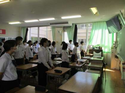 始業式の最後は校歌斉唱です。今回は伴奏と歌入りのCDを放送で流し、一人一人が心の中で斉唱しました。