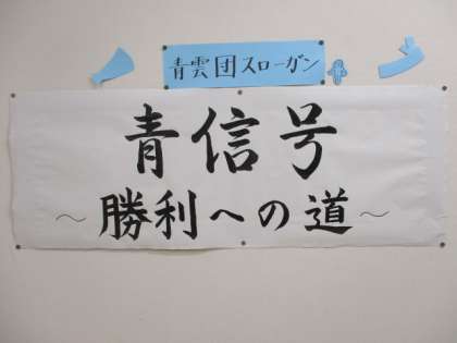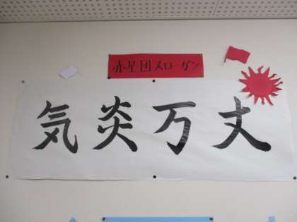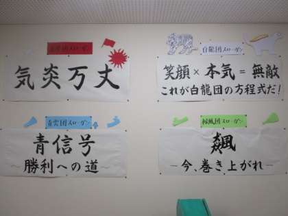 玄関から入ってすぐの生徒会コーナーには、各団のスローガンが掲示されています。写真は、中段が赤星団、下段が青雲団のものです。