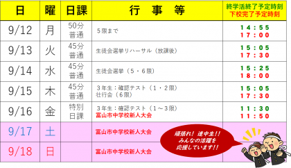 9/12(月)〜9/18(日)までの予定は、以下の通りです。