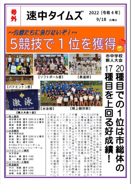 令和4年度富山市中学校新人大会での運動部の活躍を「速中タイムズ『号外版』」として発行しました。