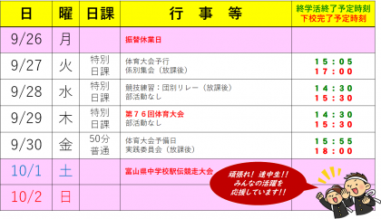 9/26(月)〜10/2(日)までの予定は、以下の通りです。
