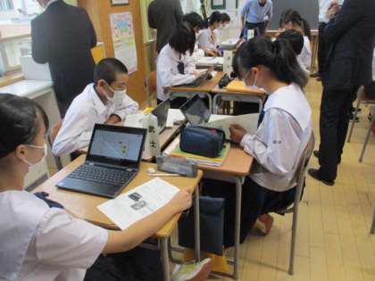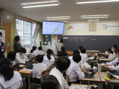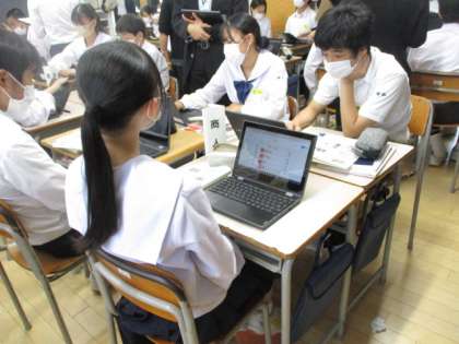 3限、28HでICTを活用した授業に関する研究授業を行いました。教科は社会科です。江戸時代の2つの政策を武士、商人、農民の立場に分かれ、どの政策が有益だったかを考えます。タブレットを用いて自分の考えを書き込み、それを皆で共有したうえで考えを深めていきました。