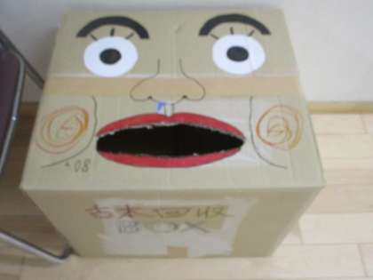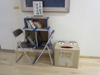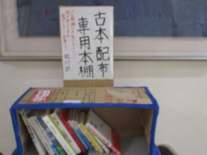 玄関前の生徒会コーナーに古本の回収・配布を行うための箱や棚が設置されています。