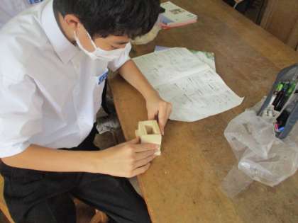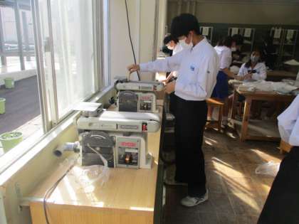 5限14Hの技術の時間の様子です。木材加工の学習をしています。ベルトサンダ等の機械や工具を使って木材を加工します。完成すればペン立てになります。