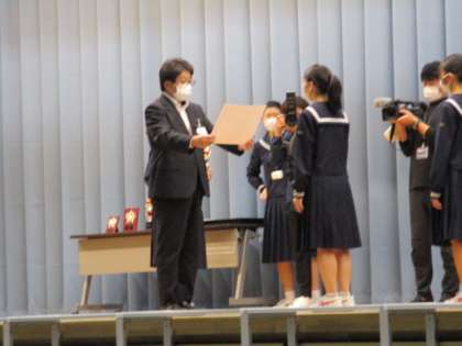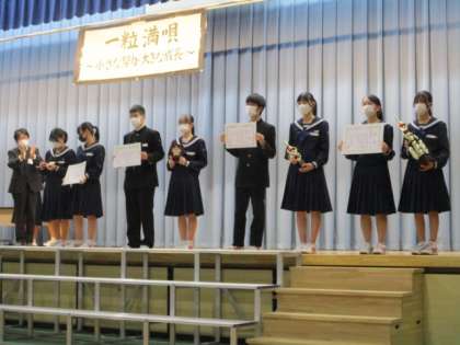 表彰式は各学年ごとに行いました。音楽科の先生の講評の後、受賞クラスが発表され表彰されました。写真は3年生の様子です。合唱コンクールの結果は以下のとおりです。