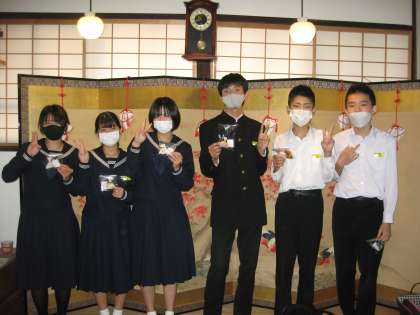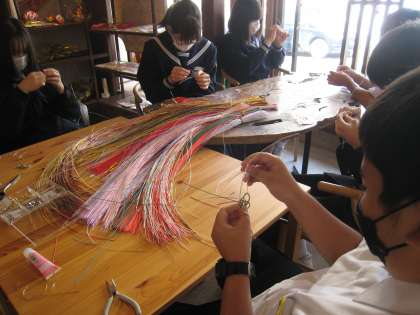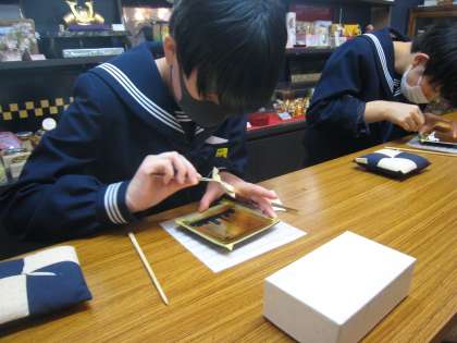 各班、必ず1カ所は体験活動を組み込んで班別活動を行いました。水引のキーホルダーをつくったり、金箔貼り体験をしたりしました。