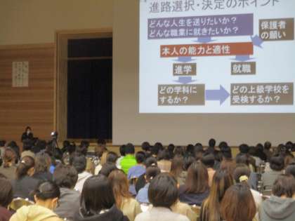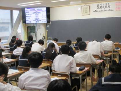 午後から3年生とその保護者を対象にした進路説明会を行いました。生徒は教室のモニターを通じて話を聞きました。3年生はいよいよ受検に向けて本格的に動き出します。