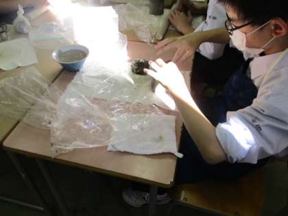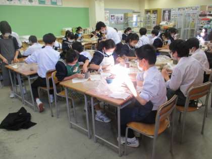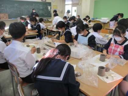 5限、14Hの美術の時間の様子です。陶芸の学習で、粘土を用いて生徒は思い思いの形や模様を作っていました。