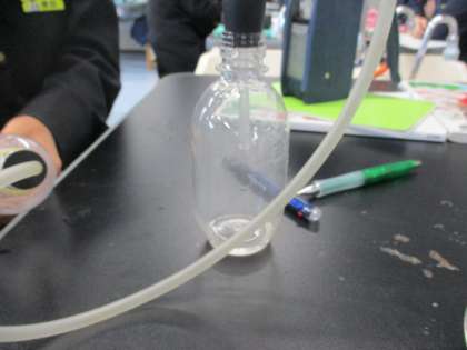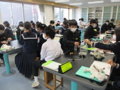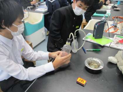 4限26H理科の授業の様子です。線香の煙と水を使って雲を再現する実験でした。ペットボトル内に白い雲ができました。