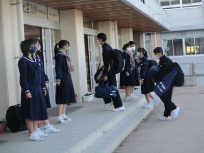 今朝は晴れて青空が広がりました。今日も生活向上委員があいさつ運動をしています。本日の下校完了時間は16:30です。
