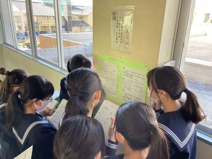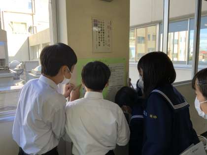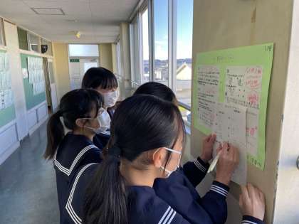 学年生徒会が企画する学力エレベーターが始まりました。学年生徒会が作った各教科の問題を廊下に掲示すると、休み時間などを使って熱心に取り組んでいる生徒の様子が見られました。期末考査にむけて学年全体の意欲が高まってきています。