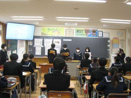 6限に27Hで新聞を一週間読んで、クラスの仲間で興味のある人の多かったものに順位をつけました。各班、担当の記事を紹介し、27Hの生徒が作ったアンケートを使って集計しました。