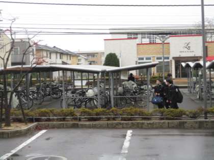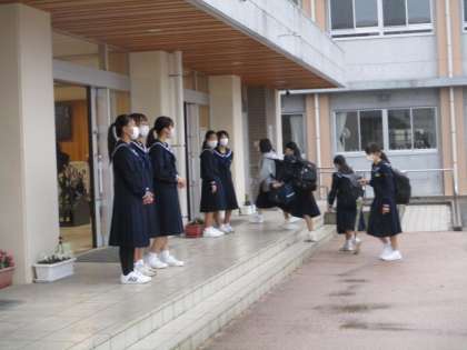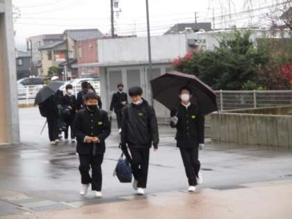 今朝は雨になり、登校時も薄暗く感じました。生活向上委員会の生徒があいさつ運動をしています。本日の下校完了時間は17:00です。