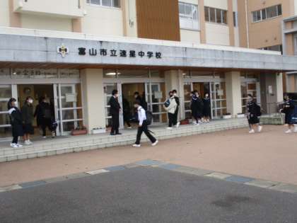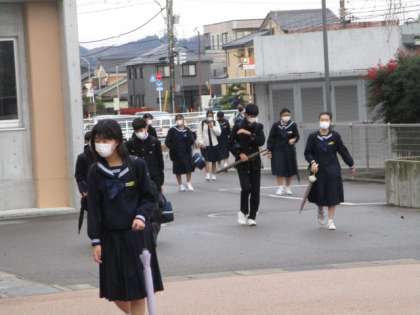 今朝の登校時は曇りになりました。3年生は今日と明日、冨山市学力調査を行います。本日の下校完了時間は17:00です。