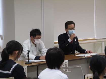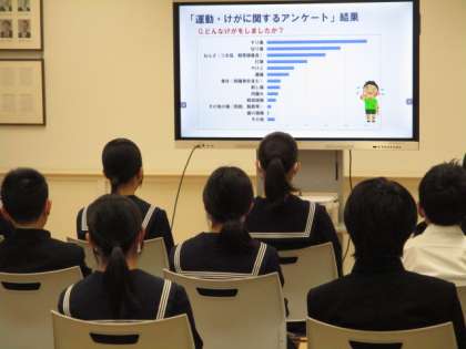 保健委員会の生徒がスライドを用いてアンケートの結果を交えた発表を行いました。その後、学校医、学校薬剤師の先生方からアドバイスをしていただきました。