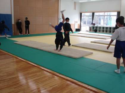 3限、18Hの様子です。マット運動をしています。倒立や側転など様々な技を練習しています。
