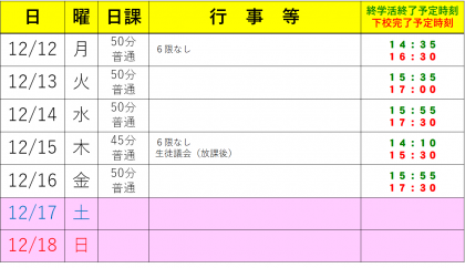 12/12(月)〜12/18(日)までの予定は、以下の通りです。