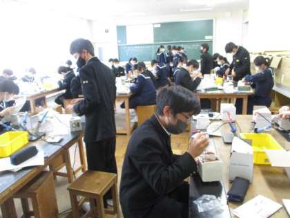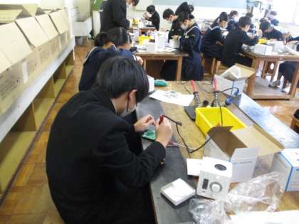 29H、3限の技術の時間の様子です。エコキューブラジオを製作しています。はんだ付けの作業は初めて経験する生徒も多いと思います。