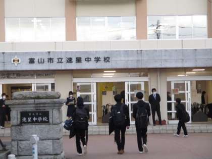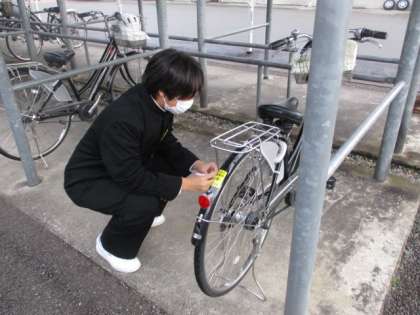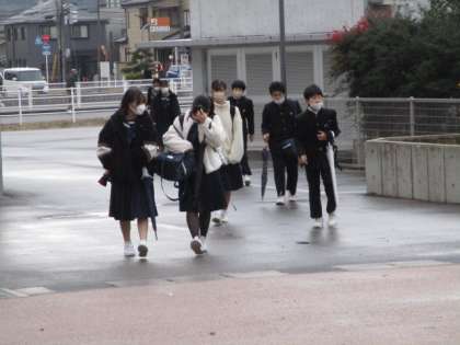 今朝は登校時、小雨になりました。生活向上委員会の生徒が自転車の鍵かけチェックを行っています。本日の下校完了時間は17:00です。