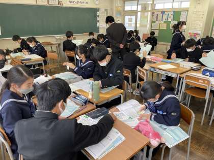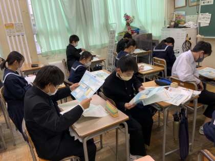総合の時間に進路適性検査の結果が返却されました。自分の性格や好きな教科から、向いている職業が何か予想されました。クラスの生徒と話をしながら、楽しく学習することができました。「10年後は、お互い何をしているかな?」